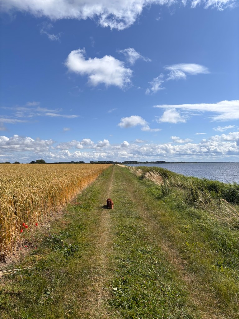 Für Spaziergänge mit Hund bietet diese Landschaft viel Platz und Weite. Viele Wege führen entlang der Küste oder durch offene Felder mit Blick über den Bodden.