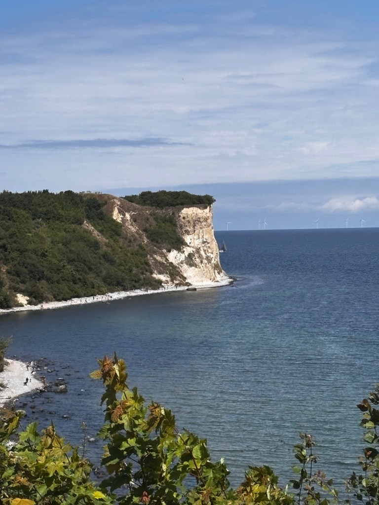 Am Kap angekommen öffnet sich sofort eine beeindruckende Landschaft. Die Küste fällt hier steil zur Ostsee ab, und die weißen Kreidefelsen leuchten im Sonnenlicht. Der Blick reicht weit über das Meer.