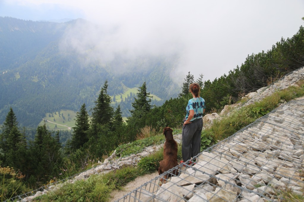 Floyd, Paul und ich waren besonders gern auf den Almwegen unterwegs. Diese Wege führen über weite Bergwiesen und bieten immer wieder freie Ausblicke auf die umliegenden Gipfel der Chiemgauer Alpen. Die Wege sind meist breit und gut ausgebaut, sodass man entspannt laufen kann, ohne ständig über steinige Bergpfade steigen zu müssen. Genau diese Mischung macht die Gegend ideal für Wanderungen mit Hund.