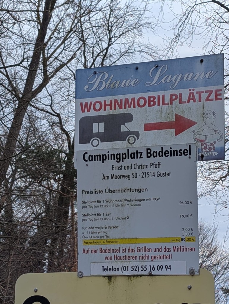 Blick auf den Campingplatz „Freizeitwelt Güster“, welcher einen riesigen Leerstand von mehreren hundert Plätzen hat. Der andere Campingplatz „Blaue Lagune“ ist immer schnell ausgebucht und wird zum Großteil von Dauercampern genutzt.