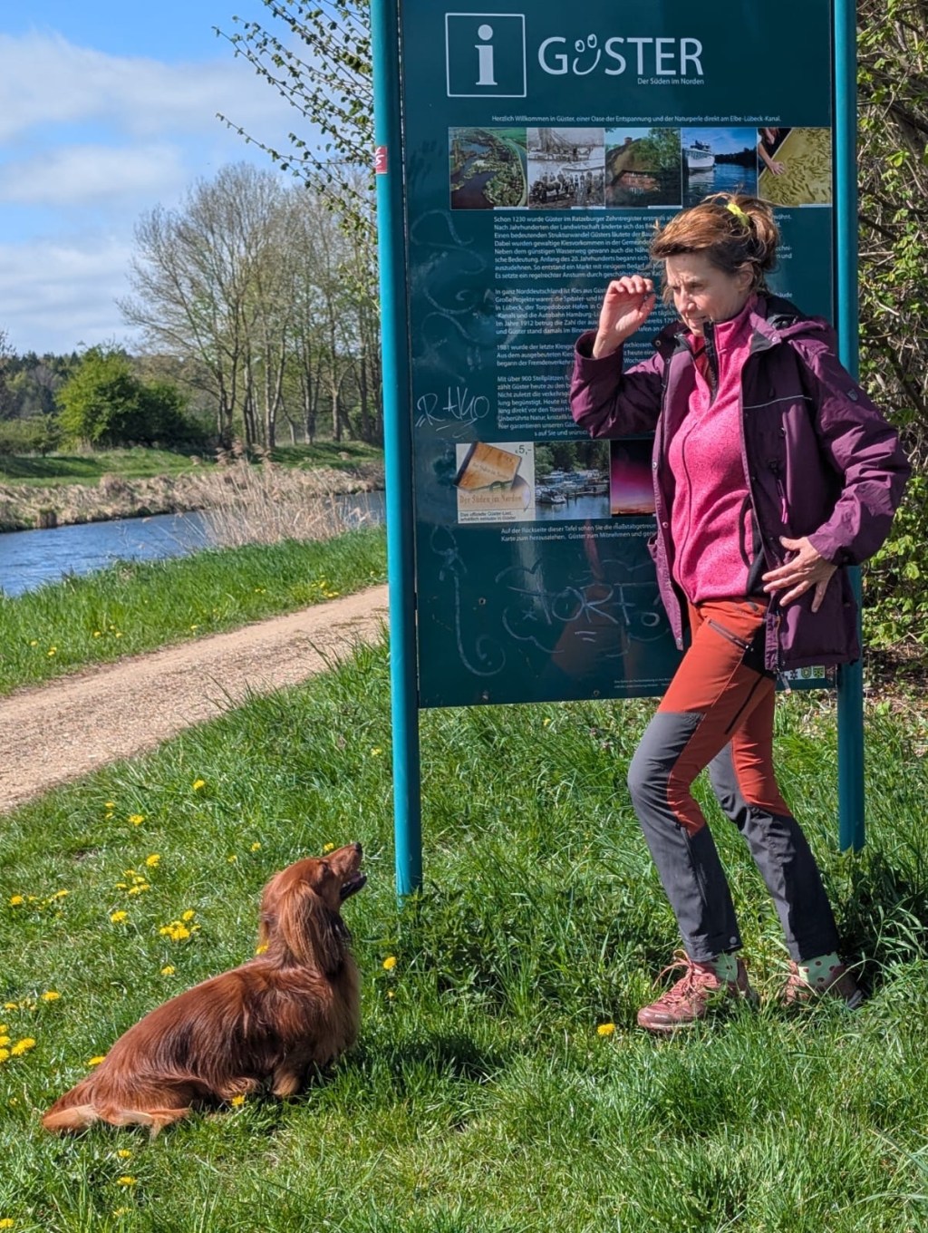Meine Lieblings Hunderunde beginnt direkt am Parkplatz, gegenüber der blauen Lagune, dann geht man am Badesee vorbei, dort wo also die Strände für die Tagesgäste sind und dann weiter am Kanal zurück. Das ist eine Runde von so zwei Stunden und macht immer Mega viel Spaß.